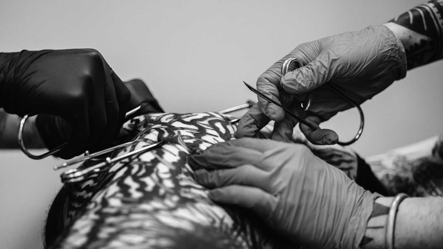When you are ready, we will guide you back to the massage bed, where we will remove the hooks, clean your skin, and bandage the wounds.